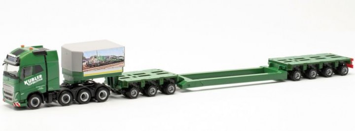 Relativ neu im Fuhrpark des Schwäbisch-Haller Unternehmens Kübler ist die Marke Volvo. Diese 4-achsige Zugmaschine der neusten Generation wurde neben mehreren 3-achsigen Zugmaschinen beschafft. Der aufgesattelte 7-achsige Goldhofer-Tieflader wird mit einer Plane auf der Pritsche ausgeliefert, die wie im Original mit einem Bild eines Kübler-Eisenbahntransports gestaltet ist.