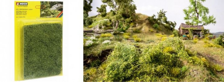 Das Trägermaterial des super-realistischen Buschwerks ist eine natürliche Faser, die stabil und gut formbar ist. Für die natürliche optische Wirkung wurde es mit einer speziellen Mischung aus NOCH Laub und NOCH Struktur-Flock beflockt. Dadurch erhalten wir ein einzigartiges Produkt, das ideal ist, um dichte Vegetation im Modell darzustellen.