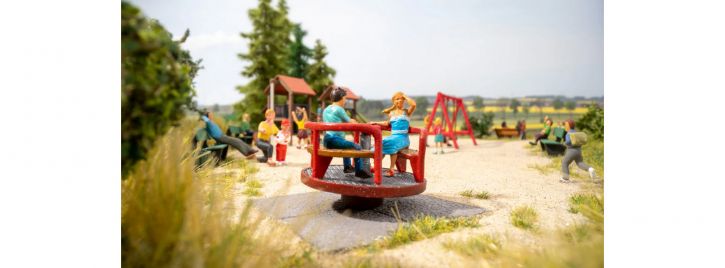 Das NOCH "micro-motion Kinderkarussell" eignet sich hervorragend, um einen Kinderspielplatz wie in der Wirklichkeit nachzugestalten und in Szene zu setzen. Das Kinderkarussell unter den Spielgeräten auf einem Spielplatz lieben wirklich alle Kinder. Mit aller Kraft wird der Kreisel in der Mitte gedreht, um eine schnelle Geschwindigkeit zu bekommen. Aber aufgepasst... richtiges festhalten am Rand ist sehr wichtig, um schlimme Unfälle zu vermeiden. Wenn man die Augen schließt spürt man die Drehungen noch intenstiver und man fühlt sich als ob man fliegen kann. Neben der Kinderschaukel, der Vogelnestschaukel, einer Rutsche und dem Sandkasten darf das Kinderkarussell auf keinem Spielplatz fehlen. Hier zeigt sich wer wirklich Kraft hat und das Karussell so richtig in Schwung bringt. Glücklich und schwankend von den starken Drehungen steigen die Kinder nach einer wilden Fahrt im Karussell aus und müssen aus dem Drehwurm erst einmal wieder rauskommen. Hier ist Spaß für Jung und Alt vorporgrammiert und wilde Fahrten bringen die Kinderaugen zum Leuchten.