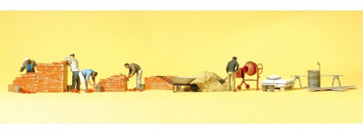 Preiser Figurenset Maurer mit Zubehör im Maßstab 1/87. Inhalt: 5 Figuren, 5 Mauerstücke, Zementmischer, Sandhaufen, Schubkarre, 20 einzelne Ziegelsteine, 6 Eimer, Fass mit Wasserhahn, Palette mit Mörtel und 5 Bretter (1 davon auf Böcken).