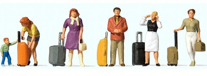 Preiser H0 Stehende Reisende mit Trolleys im Maßstab 1/87. Inhalt: 5 Figuren mit Gepäck, 1 Kind.