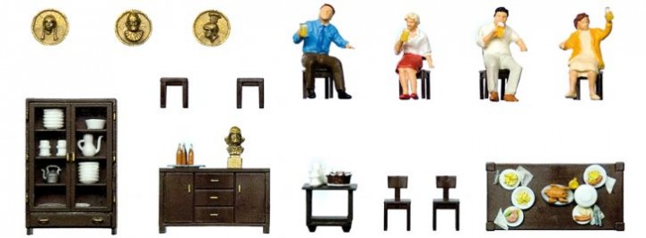 Preiser H0 Beim Mittagessen, Speisezimmereinrichtung. Figuren mit Zubehör im Maßstab 1/87.