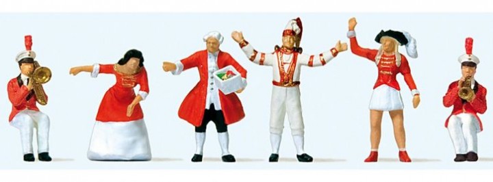 Preiser H0 Miniaturfiguren für den Prinzenwagen im Karneval/Fasching. Packung mit 6 Stück handbemalten Figuren in Gardeuniform.