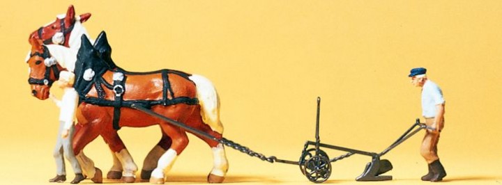 Preiser Figuren Bauer mit Pflug und Pferden | mehrteilig | Spur H0 im Maßstab 1/87.