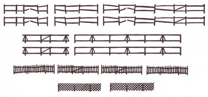 Zäune-Set bestehend aus vier verschiedenen Zauntypen unterschiedlicher Länge, darunter ein Latten- und ein Jägerzaun.