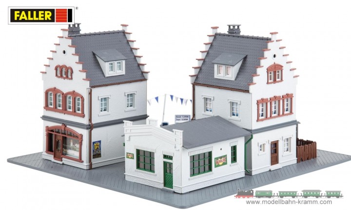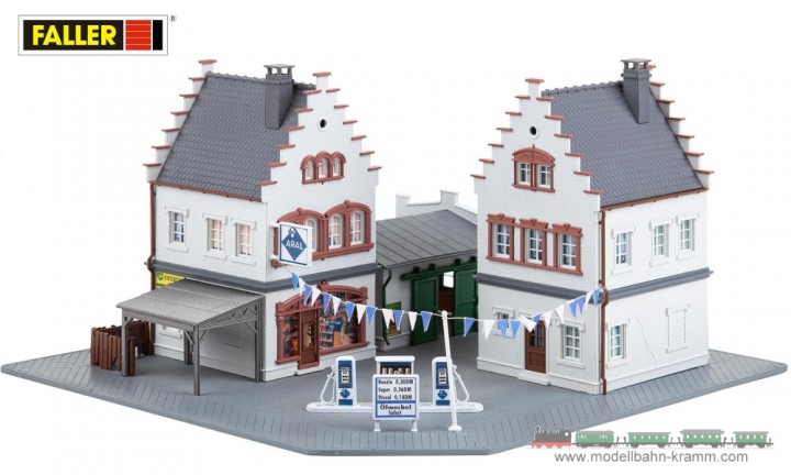 Tankstation in der Kleinstadt. Harmonisches Modell-Set bestehend aus zwei freistehenden Wohnhäusern mit Treppengiebeln, einer Werkstatt mit Schiebetoren und einer Tankinsel. Für die Ausgestaltung liegen ein Vordach, ein Zaun und ein ARAL-Schild bei. Bodenplatte inklusive.