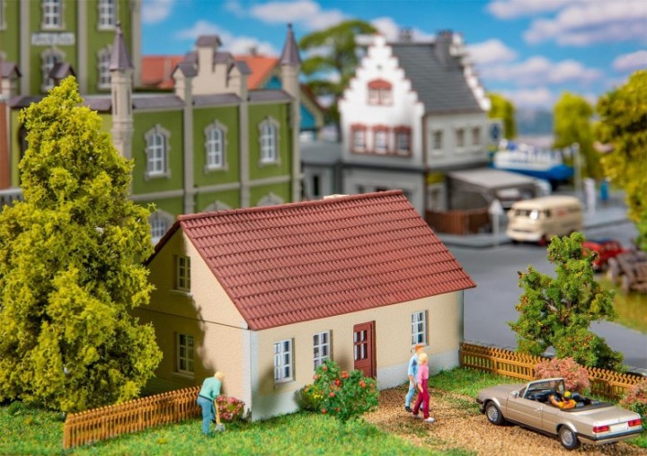 Ideal für Modellbauanfänger. Hell verputztes, einstöckiges Wohnhaus mit Ziegeldach und einem Schornstein. Gebäudesockel und -kanten sind farblich abgesetzt.