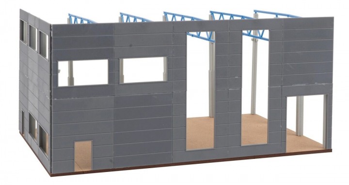Bauen mit System. Im Aufbau befindliche Produktions-, Speditions- oder Lagerhalle. Zwei Wände mit Tor- und Fensteraussparungen, die Stützen und das Tragwerk sind bereits errichtet. Bodenplatte beiliegend. Kompatibel und erweiterbar mit Systemelementen der FALLER Goldbeck-Serie.