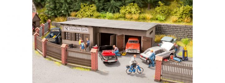 Kleine Szene mit viel Liebe zum Detail. Die charmante Hinterhof-Werkstatt passt in jedes Industriegebiet oder kann für sich alleine stehen. In den beiden Garagen der kleinen Werkstatt wird getüftelt und geschraubt, im angeschlossenen Büro werden die Kunden betreut und Aufträge bearbeitet.