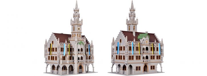 Vollmer Architekturmodelle sind das Ergebnis modernster Fertigungstechnik und beispielhafter Konstruktionsarbeit. Dieses Rathaus ist wieder einmal ein Beweis für die einmalige Qualität der Vollmer Bausätze. Zahlreiche Türmchen und Spitzbögen im Untergeschoss schmücken dieses detailreiche Rathaus.