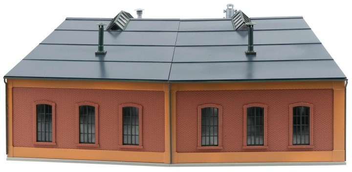 Für das große Bw. 2-ständiger Erweiterungsbau ohne Seitenwände für den »Ringlokschuppen mit 12°-Teilung«, Art. 120281. Jeder Schuppenstand ist mit drei rückwärtigen Fenstern, Rauchabzug, Oberlicht und Schornsteinkopf ausgestattet. Torantriebsteile und Anlenkdraht für den Anschluss an einen Servo enthalten (Servo, Art. 180726 separat erhältlich). Unterstand bis 290 mm LüP. Torhöhe SUK: 72 mm. Modell für alle herkömmlichen Gleissysteme geeignet. Für einen Halbkreisschuppen benötigen Sie: 1 x Art. 120281, 6 x Art. 120282.