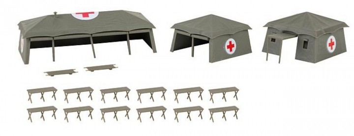 Ausstattungs-Set mit drei olivgrünen Zelten in unterschiedlichen Größen und mit Rotkreuz-Aufdruck. Feldbetten und Tragen liegen dem Bausatz bei.