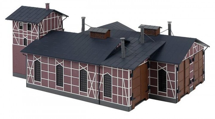 Lokschuppen mit einem Wasserturm auf der rückwärtigen Seite. Der 3-ständige Fachwerkbau bietet in drei unterschiedlich langen Unterständen Platz für Loks von 190, 240 und 280 mm LüP (Gleismittenabstand: 63 mm). Die Tore können manuell geöffnet und geschlossen werden (Torhöhe: 65 mm).