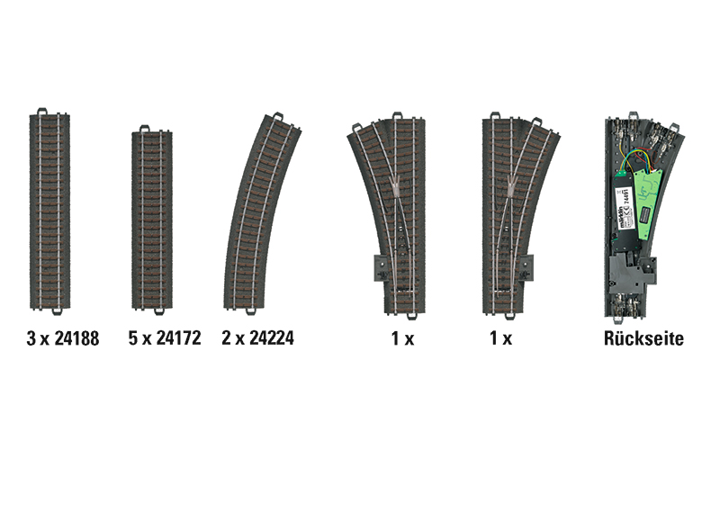 3 gerade Gleise 24188, 5 gerade Gleise 24172, 2 gebogene Gleise 24224, 1 Weiche links 24611 und 1 Weiche rechts 24612, jeweils mit eingebautem Decoder und Antrieb. Aufbau- und Anschlussanleitung liegt bei.