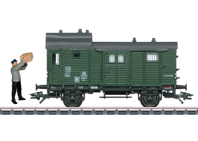 Güterzug-Gepäckwagen mit Dachaufsatz. Schiebetüren zum Öffnen. Länge über Puffer 9,6 cm. 1 Preiser-Figur als Bahnpersonal liegt bei. Gleichstromradsatz E700580.