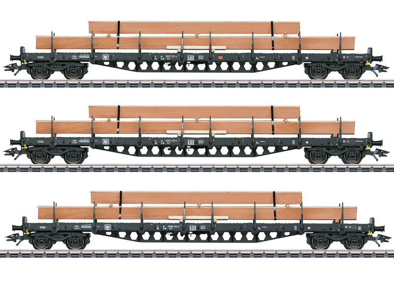 Alle Wagen mit Ladegut Leimholzbinder. Unterschiedliche Betriebsnummern und einzeln verpackt im Umkarton. Gesamtlänge über Puffer ca. 69 cm.