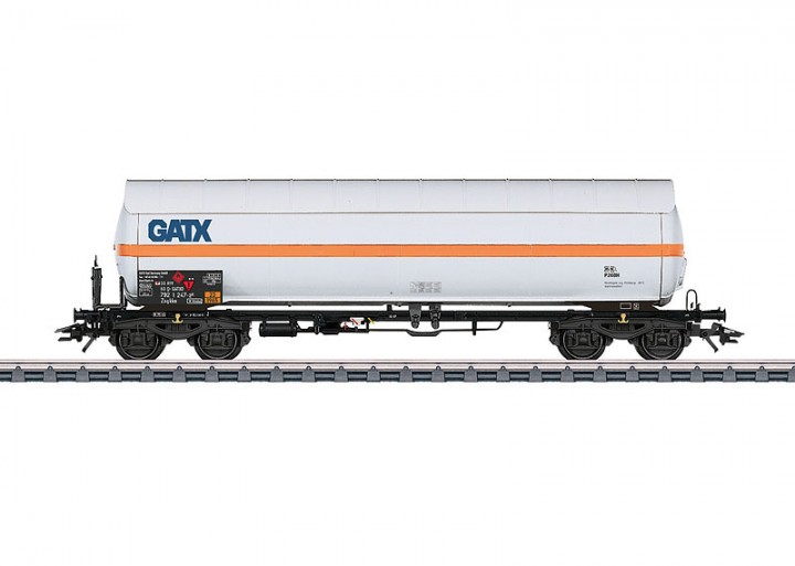 Vierachsiger Druckgas-Kesselwagen mit Sonnenschutzdach. Zahlreiche angesetzte Details. Länge über Puffer 18 cm. Gleichstromradsatz E700580.