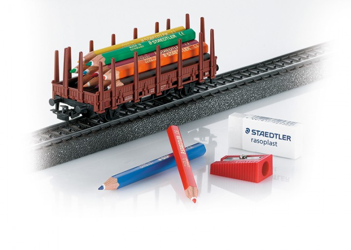 Rungenwagen mit neuer Betriebsnummer. 18 fest stehende Rungen. Relex-Kupplungen. Länge über Puffer 11,5 cm. Inklusive 12 kurzen STAEDTLER Farbstiften, einem STAEDTLER Radierer rasoplast sowie einem STAEDTLER Kunststoffspitzer (Kunststoffspitzer kann farblich variieren). Farbstifte dienen als Wagenbeladung.