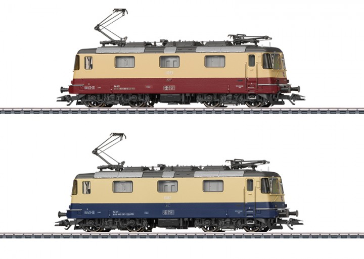 Vorbild: 2 Elektrolokomotiven Re 421 in unterschiedlichen Farbgebungen. 1 Elektrolokomotive in TEE-Farbgebung purpurrot/beige mit der Betriebsnummer 421 393-0 und 1 Elektrolokomotive in Rheingold-Lackierung kobaltblau/beige mit der Betriebsnummer 421 387-2. Privatbahn-Lokomotiven der International Rolling Stock Investment GmbH (IRSI), betrieben von der TR Trains Rail AG. Betriebszustand um 2020.
