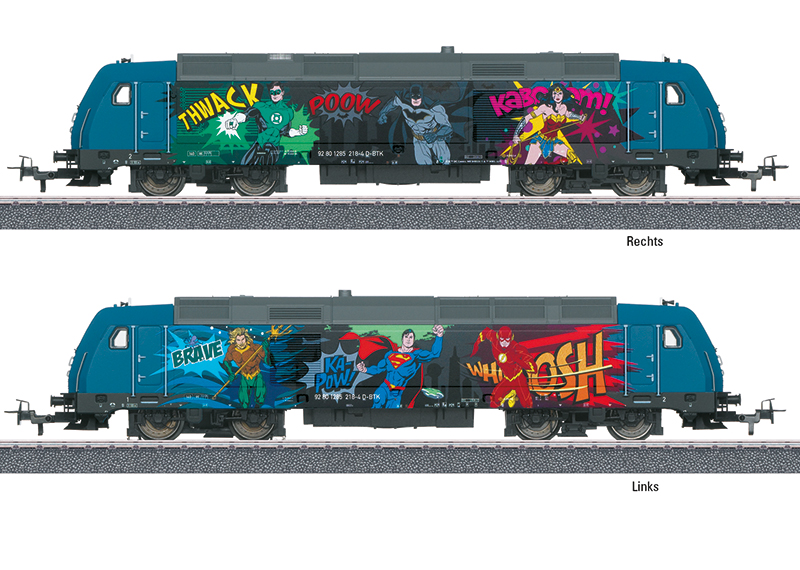 Diesellokomotive der Baureihe 285 in einer tollen Gestaltung mit verschiedenen Superhelden. Metallausführung mit vielen integrierten Einzelheiten. Digital steuerbare Lokomotive mit Licht- und Soundfunktionen. Fahrtrichtungsabhängig wechselndes Dreilicht-Spitzensignal. Beleuchtung mit warmweißen Leuchtdioden. Zwei geschwindigkeitsunabhängige Soundfunktionen passend zu den Superhelden Charakteren. Lokomotive mit Digital-Decoder. Angetriebene Achse mit Haftreifen für optimale Zugkraft. Lokomotivlänge 22 cm.