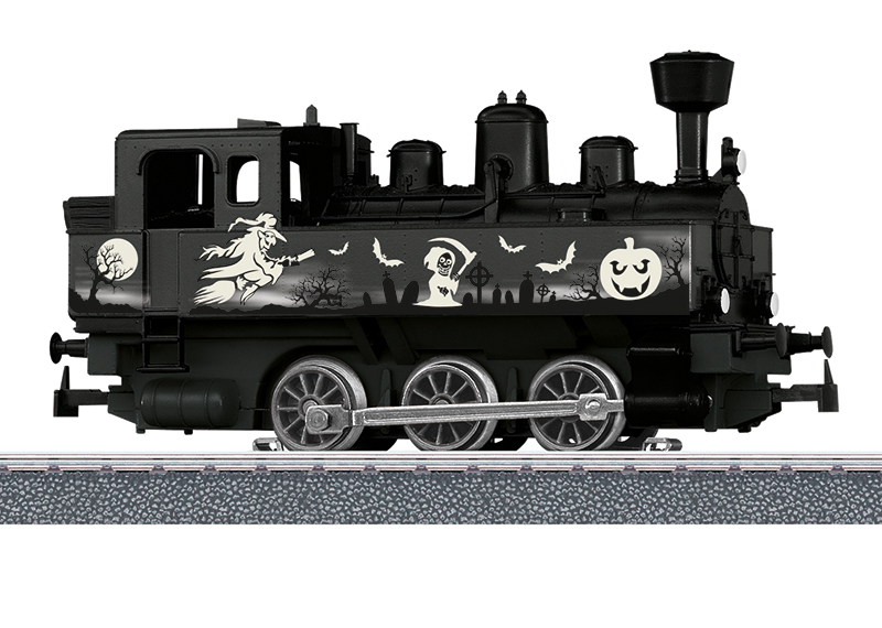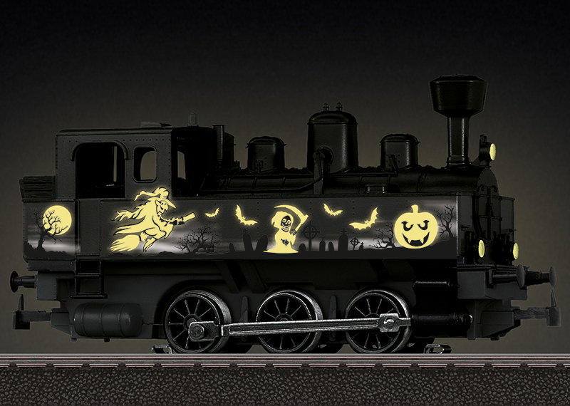 Dampflokomotive in einer gruseligen Halloween-Gestaltung. Einzelne Bedruckungselemente und das Dreilicht-Spitzensignal leuchten im Dunkeln – Glow in the Dark. Mit mfx Digital-Decoder. 1 Achse angetrieben. Haftreifen. Kupplungshaken. Länge über Puffer 10,8 cm.