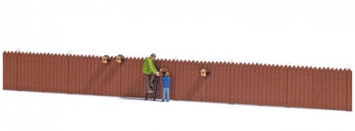 Mann und Junge, die einen Nistkasten aufhängen. Mit Leiter und 4 Nistkästen aus echtem Holz. Inklusive Holzzaun mit Pfosten.