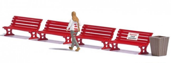 Frau, die versehentlich auf einer frisch gestrichenen Parkbank gesessen hat. Mit 4 Bänken und Abfallkorb. Inklusive Schildern »Frisch gestrichen« zum Ausschneiden.
