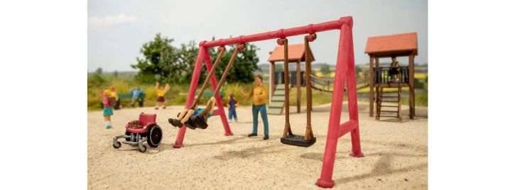 Die NOCH "micro-motion Schaukel" eignet sich hervorragend, um einen Kinderspielplatz wie in der Wirklichkeit nachzugestalten und in Szene zu setzen. Wer erinnert sich nicht gerne an die schönen Tage im Sommer zurück, wo man mit den besten Freunden auf dem Spielplatz auf der Schaukel saß. Ob kleine oder große Kinder - hier kribbelt es bei jedem im Bauch wenn der Papa, die Mama oder auch die Großeltern von hinten schwungvoll das Kind auf der Schaukel anschucken. Wenn man den Trick raus hat, wie man sich alleine anschuckt, schwingt man in hohem Bogen durch die Lüfte und sieht den großen Spielplatz von oben. Das erweckt doch wirklich bei jedem wunderschöne Erinnernungen an einen Tag auf dem Spielplatz mit den Liebsten. Neben der Schaukel erfreuen sich Kinder vorallem auch an einer Vogelnestschaukel, wo eine Entspannung zwischen den Schaukeleinheiten perfekt eingebaut werden kann. Auch eine Rutsche, Wippe oder der Sandkasten darf auf keinem kindgerechten Abenteuerspielplatz fehlen. Hier geht doch wirklich jedes Kinderherz auf und Spaß ist vorprogrammiert.
