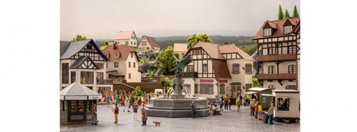 Brunnen sind auf nahezu jedem Dorf- und Martplatz zu finden und schaffen eine einzigartige Atmosphäre. Egal ob Dorffeste, Märkte oder Gastronomie, das Leben in den Ortschaften findet meist rund um den zentralen Brunnen statt. Der Stadtbrunnen für die Spur H0 ist ein besonders attraktives Objekt. Der Brunnen hat eine Grundfläche von 10 cm x 10 cm und ist inklusive der Statue 7,5 cm hoch. Die Statue auf dem Brunnen stellt eine Walküre dar und ist 3,5 cm hoch. Walküren entstammen der nordischen Mythologie und sind häufig als Statuen oder Brunnenfiguren zu finden. Der Brunnen selbst wird aus dem bekannten NOCH Struktur-Hartschaum hergestellt. Die Statue ensteht im 3D Druckverfahren. Sowohl der Brunnen als auch die Walküre werden aufwändig handkoliert.