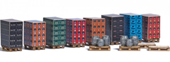 BUSCH Paletten mit Getränkekisten und Fässern | Anlagenbau Bausatz Spur H0 1/87