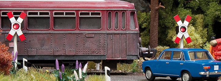 BUSCH 5928 Warnkreuze "DR" mit Schaltung mit LED Komplett-Set mit 2 Warnblinkern und Blinkschaltung im Maßstab 1:87 für Spurweite H0